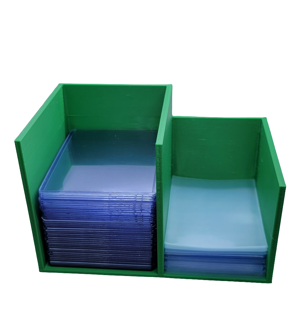 A combo penny sleeve and toploader dispenser. Can be used by collectors and breakers alike to help keep your card ripping area organized. Holds standard sized trading card penny sleeves and toploaders.